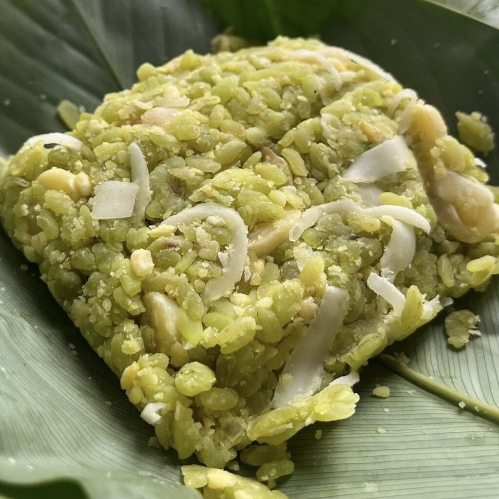 • Đậu Xanh Bùi Bùi: Lớp đậu xanh được đồ chín, giã nhuyễn mịn màng, mang lại vị béo ngậy, ngọt dịu làm nền cho hương cốm.